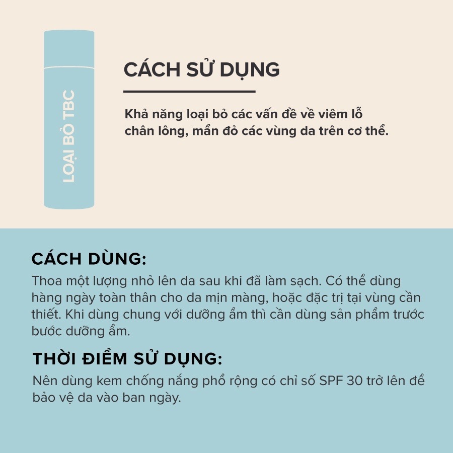 + 2% Salicylic Acid: cải thiện viêm nang lông, mụn lưng và làm mềm da.