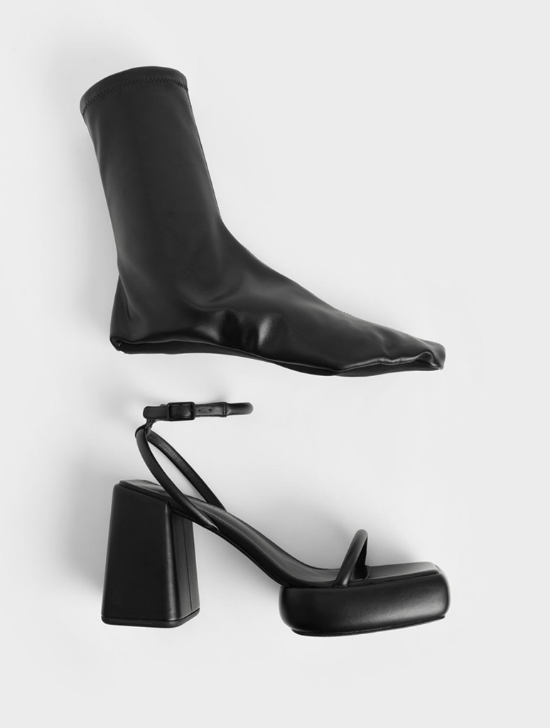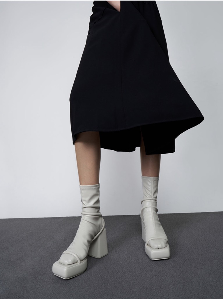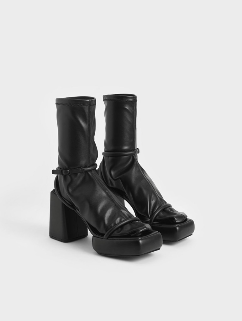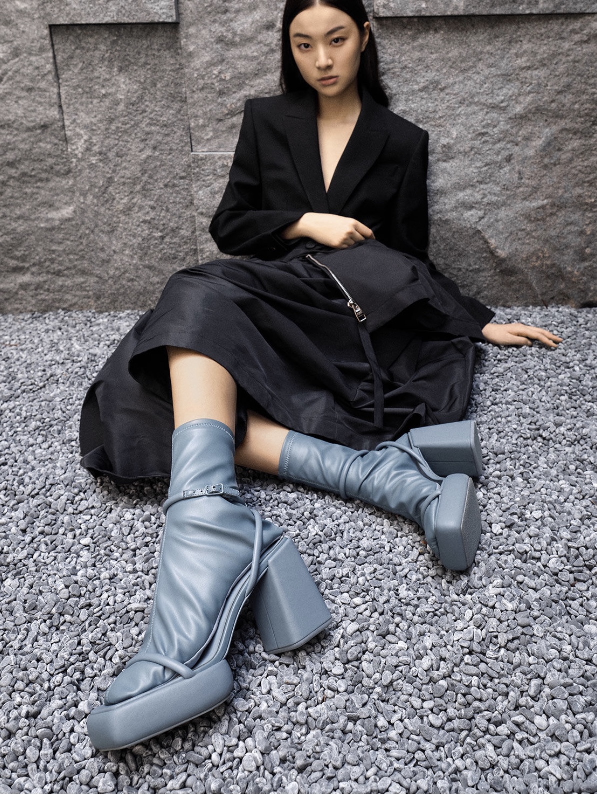 Take edgy to the next level with these calf boots. Whether it is the bright blue hue, the 9 cm platform heel, or the innovative strappy design, each element in our Lucile platform boots is a standout feature in its own right. But wait, that's not all, these boots can be separated and worn as sandals and socks, opening up new styling possibilities and transforming them into versatile transeasonal pieces. Slip into them to bring a little edge to your everyday outfits. For a contemporary finish, style them with a ruched dress and a structured bag.