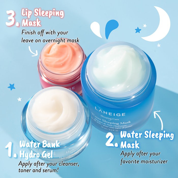 Dành cho cô nàng có làn da mệt mỏi do bận rộn, thường xuyên thức khuya và thiếu ngủ, mặt nạ ngủ phiên bản cải tiến LANEIGE Water Sleeping Mask EX Mới mang đến giấc ngủ ngon, nuôi dưỡng làn da suốt đêm dài đồng thời giúp tăng khả năng tự vệ với Sleeping Micro Biome™ & Pro-Biotics Complex.