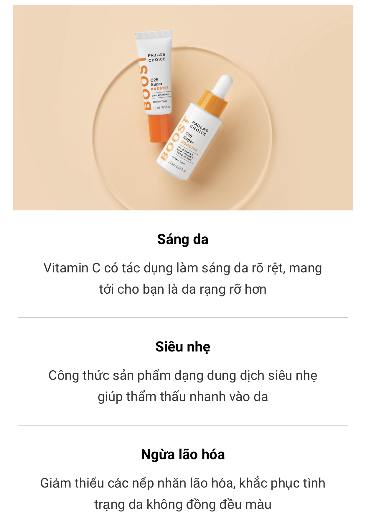 Tái tạo cấu trúc da, sẽ mang đến bạn những kết quả khác biệt trong việc cải thiện làn da không đều màu, làm sáng vùng da xỉn màu và ngăn chặn những tác động không tốt từ yếu tố môi trường. Bên cạnh đó, cũng tương tự như các dòng sản phẩm của Paula’s Choice Skincare, RESIST C15 Super Booster hoàn toàn không chứa chất tạo mùi, không gây kích ứng đồng thời không kiểm nghiệm trên động vật.