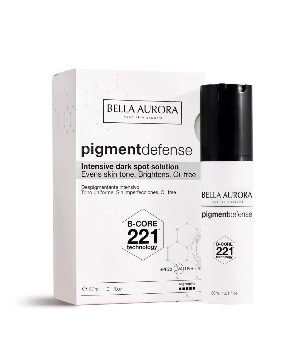 Pigment Defense Intensive Dark Spot Solution là serum dưỡng trắng cho làn da tối màu, ngăn ngừa thâm nám do lão hóa, ô nhiễm môi trường và ánh nắng mặt trời. Công thức độc quyền B- CORE 221™ - công nghệ hiệu chỉnh sắc tố được phát triển bởi Bella Aurora - giúp làm giảm đốm nâu và ngăn chặn sự xuất hiện trở lại của những đốm mới; giúp làn da được đều màu, rạng rỡ hơn.