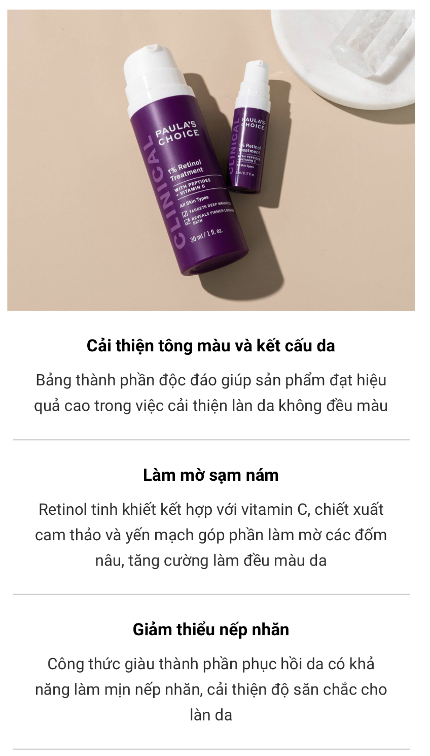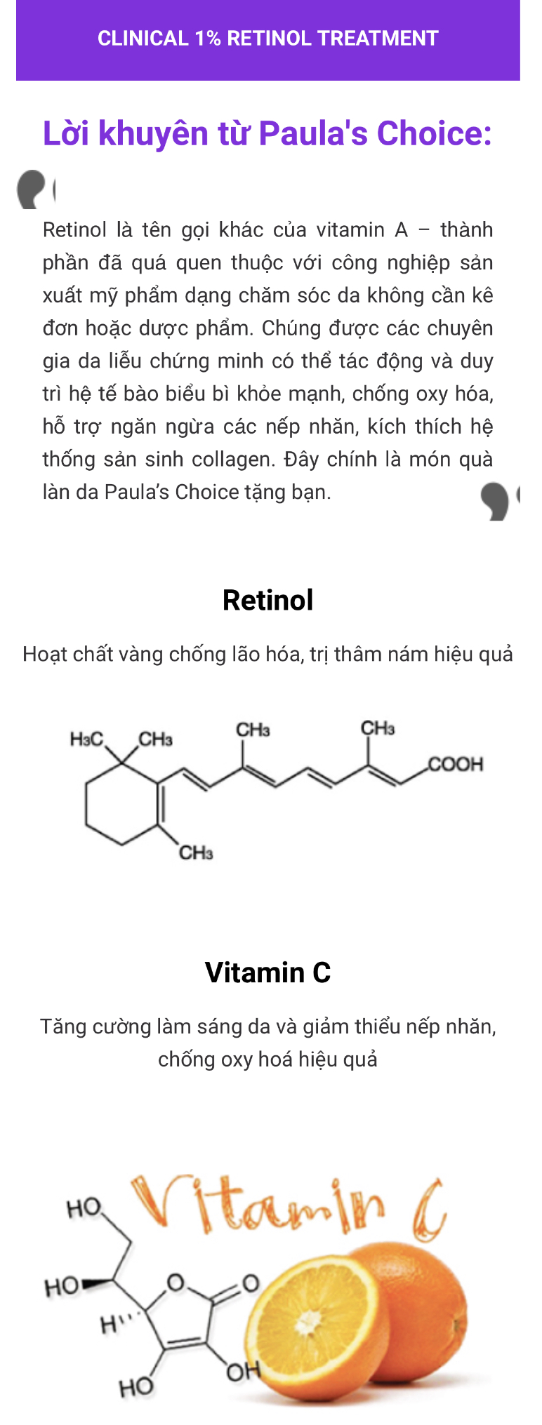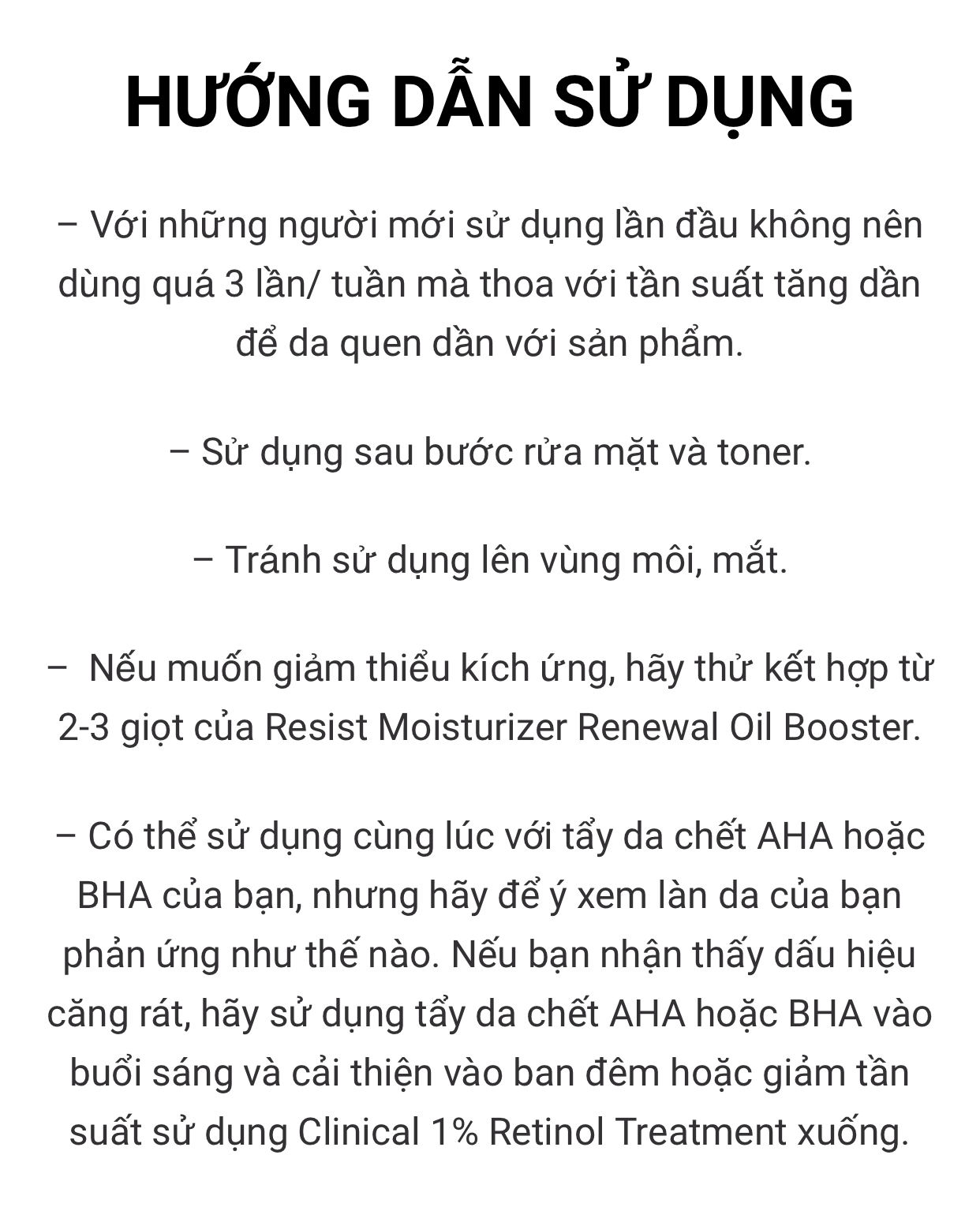 Với nồng độ retinol cao, Clinical 1% Retinol Treatment là sản phẩm siêu hoàn hảo giúp giảm thiểu các nếp nhăn và cải thiện tình trạng da không đều màu. Ngoài ra, sự kết hợp với chiết xuất cam thảo, lúa mạch cùng các thành phần có lợi sẽ làm dịu làn da mẩn đỏ, chữa lành tế bào thương tổn một cách tốt nhất.